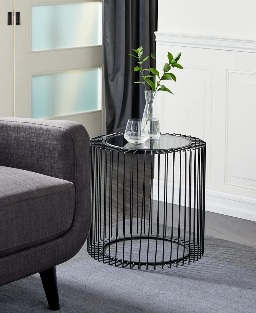 This metal and glass end table features a round shape with a cage-like design. Wipe clean with a dry cloth. The glass top of this round glass coffee table is encased in welded metal frame with an open design